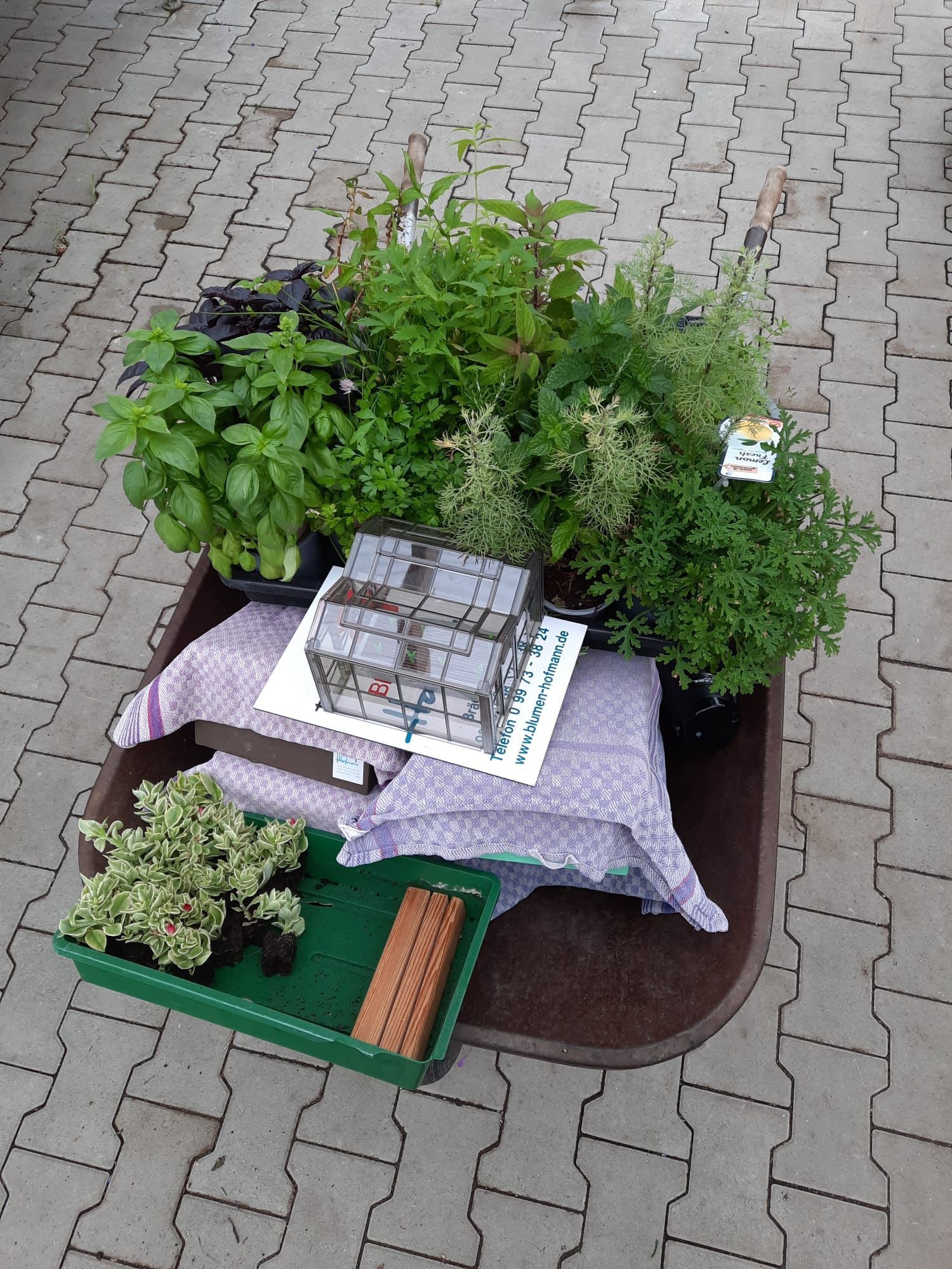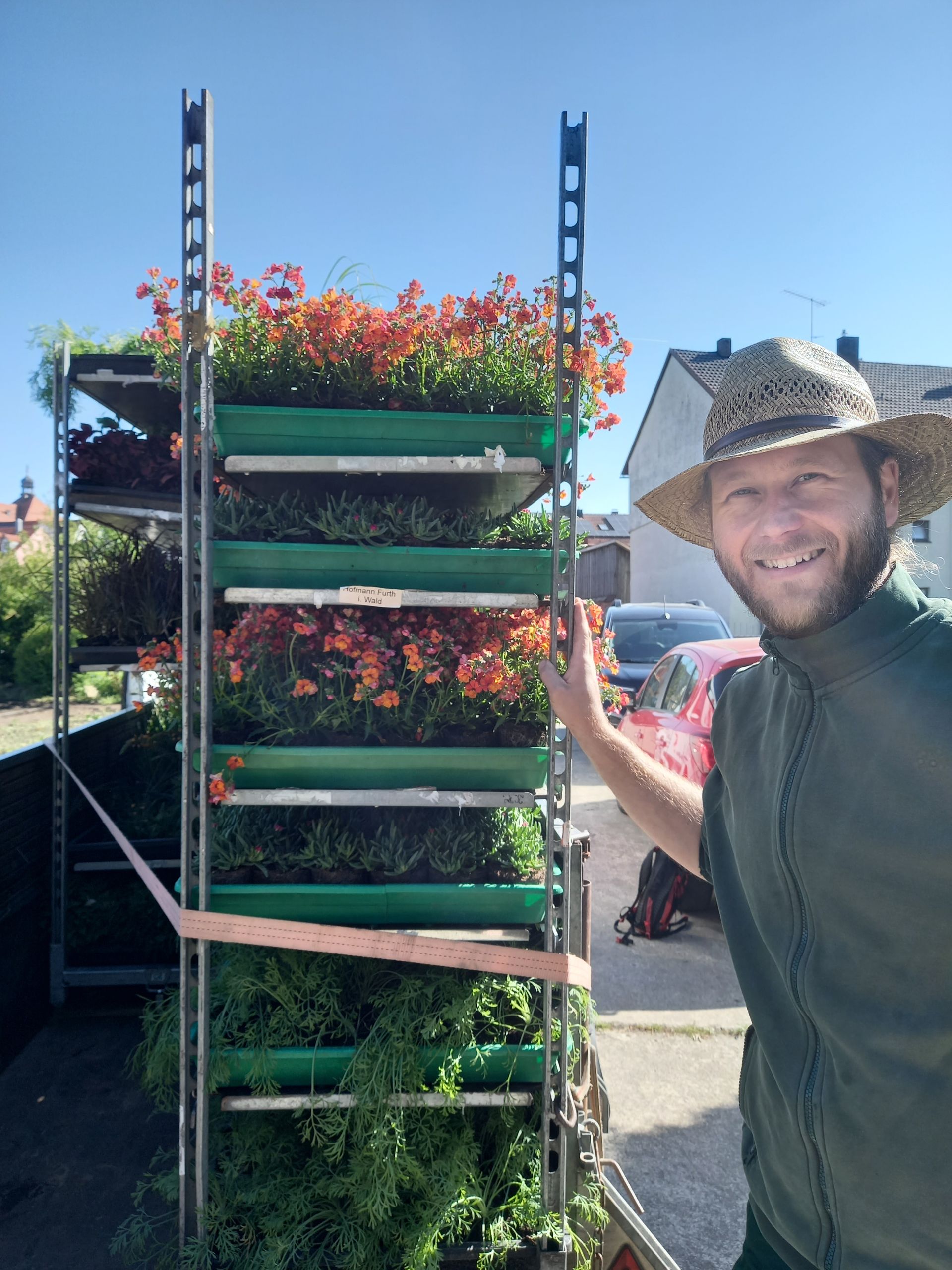 Mittig werden auf einem alten Wagen die Pflanzen, die in unseren drachenschuppenförmigen Beeten auf der Festwiese verpflanzt wurden, aufgegriffen.