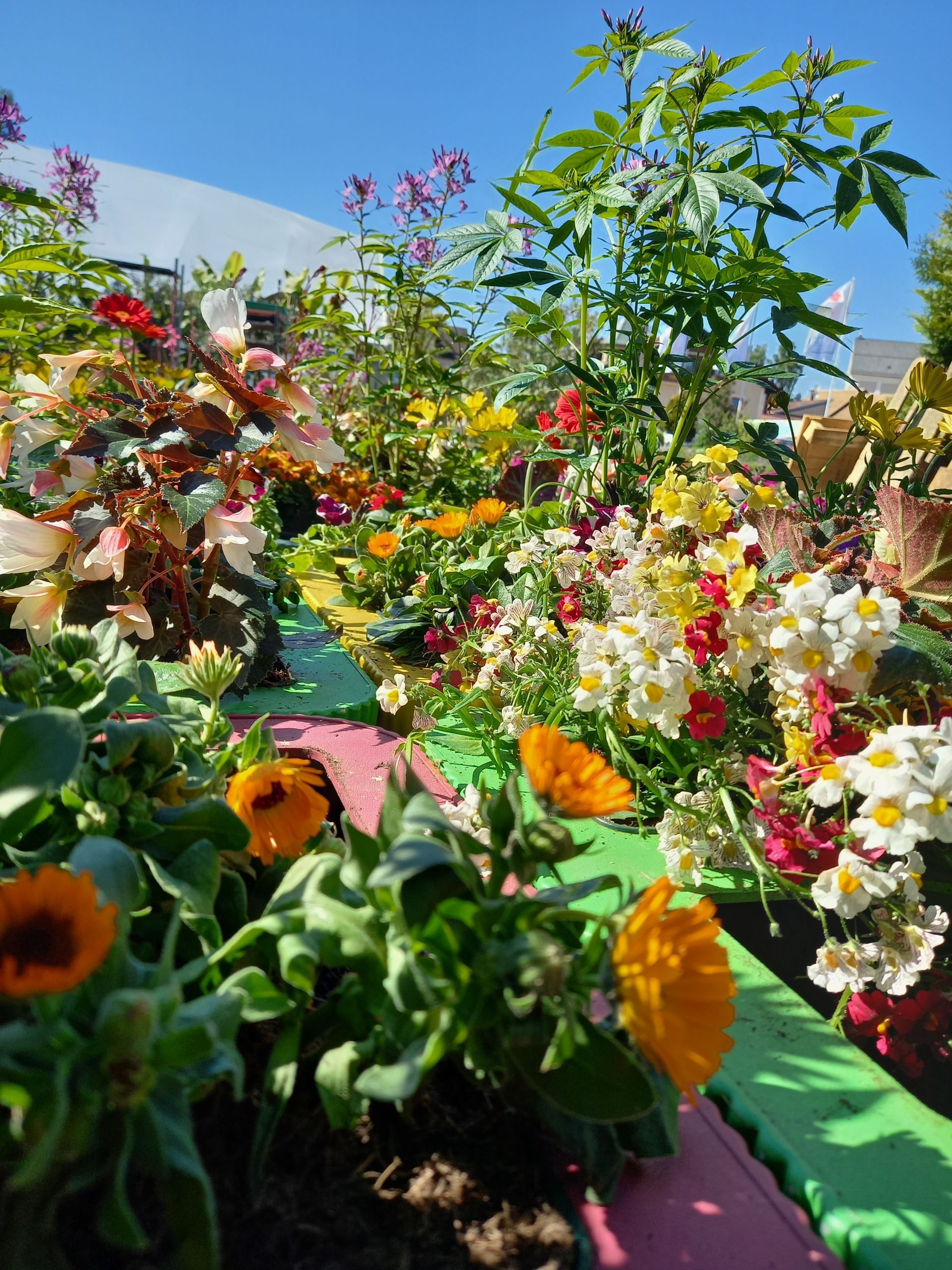 Die Farben der Beete variieren zwischen Rot-, Lila- und Blautönen sowie gelben, roten und orangen Tönen.